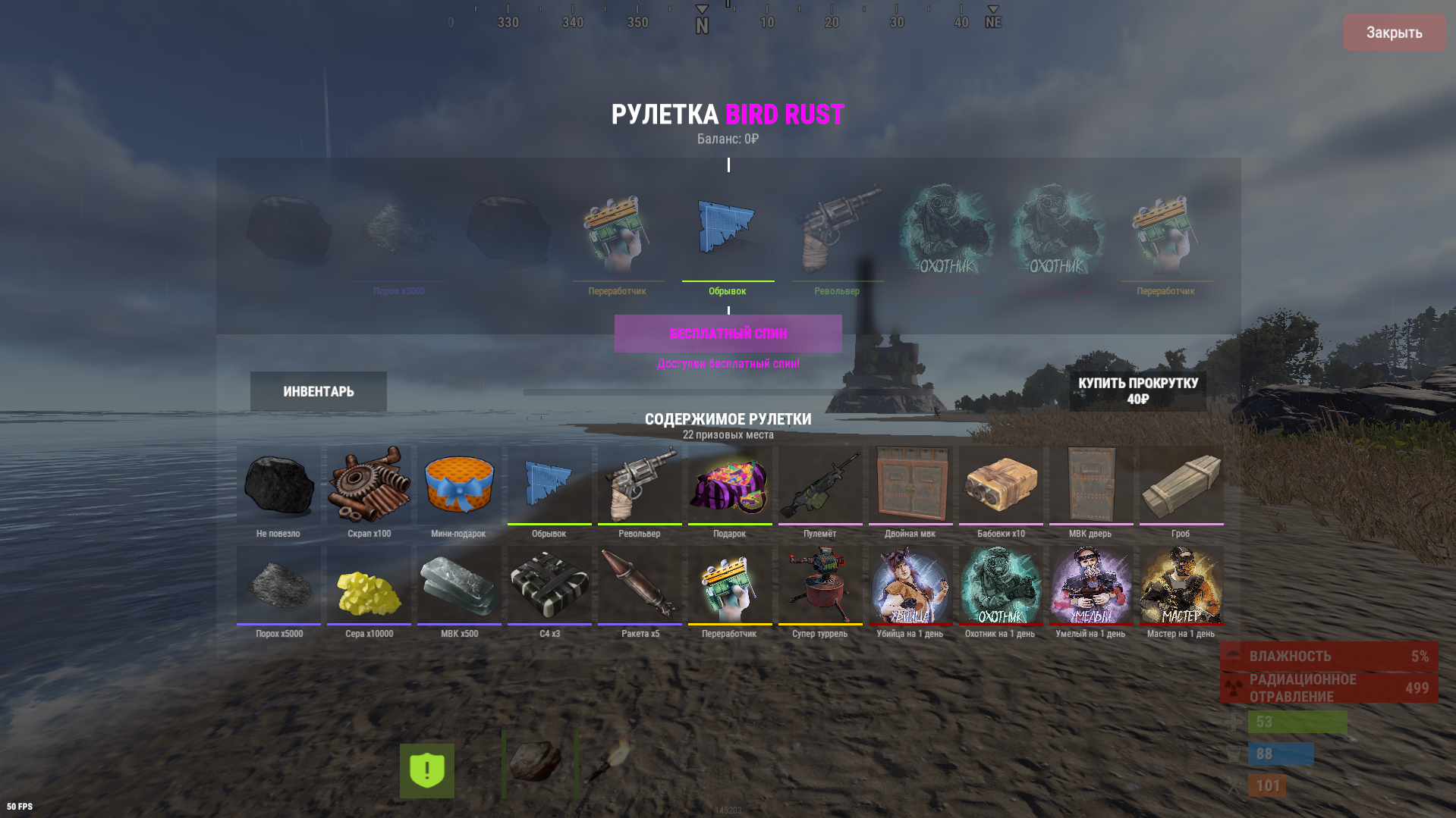 - Приз попадает на “СКЛАД” (инвентарь рулетки)