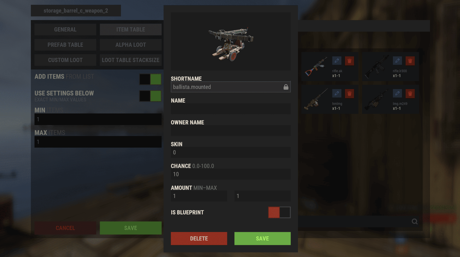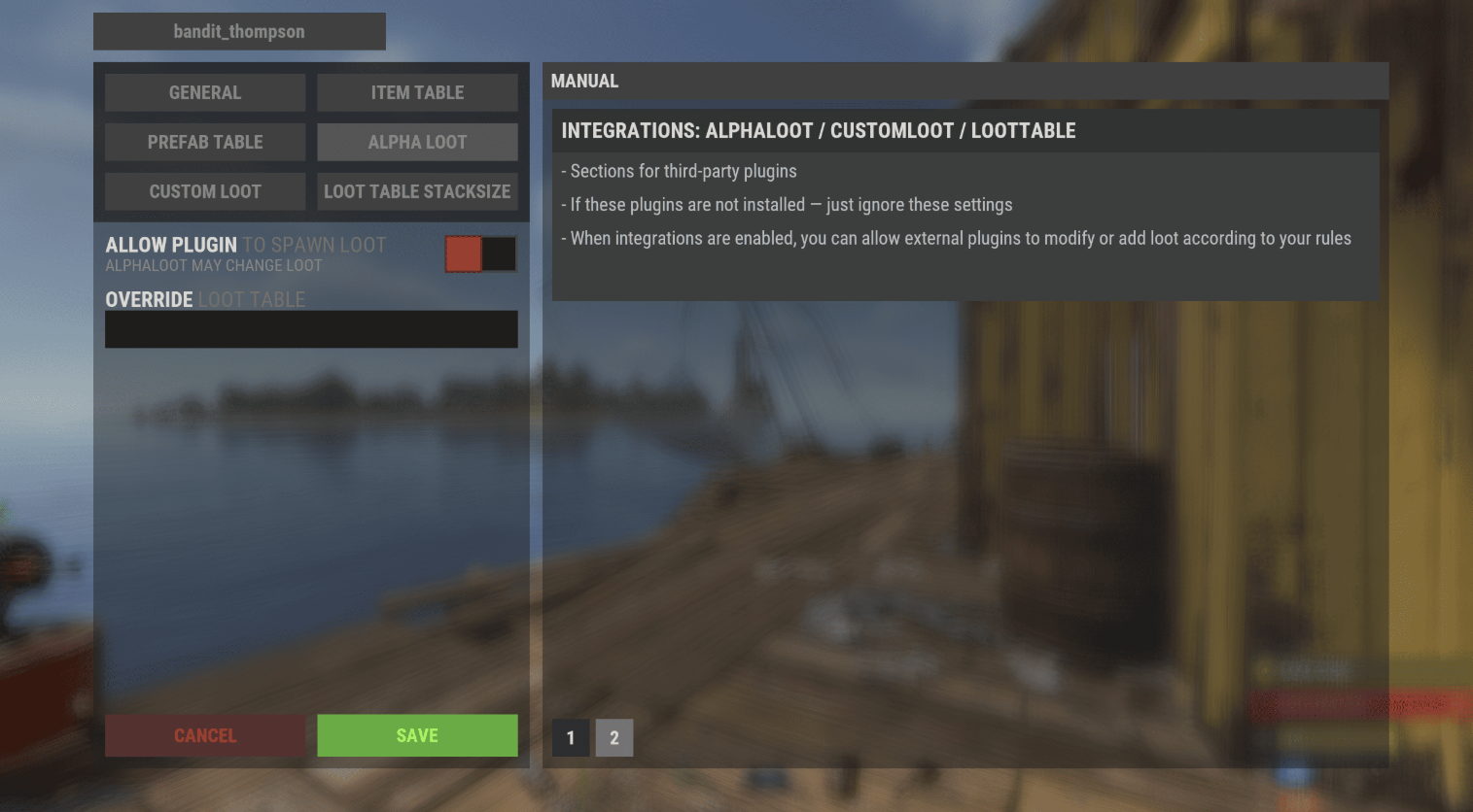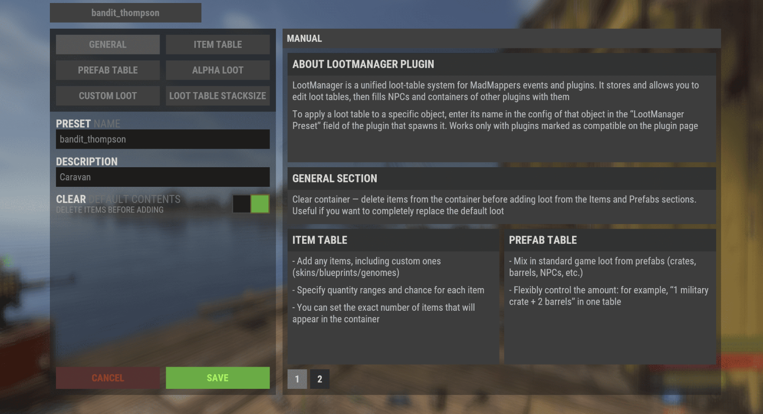 LootManager — это унифицированная система таблиц добычи, разработанная для событий и плагинов. Она хранит и управляет всеми таблицами добычи в одном месте, позволяя легко редактировать их и заполнять NPC и контейнеры из других плагинов.Чтобы применить таблицу добычи к конкретному объекту, просто введите её имя в конфигурации объекта в поле «LootManager Preset» плагина, который его создаёт.