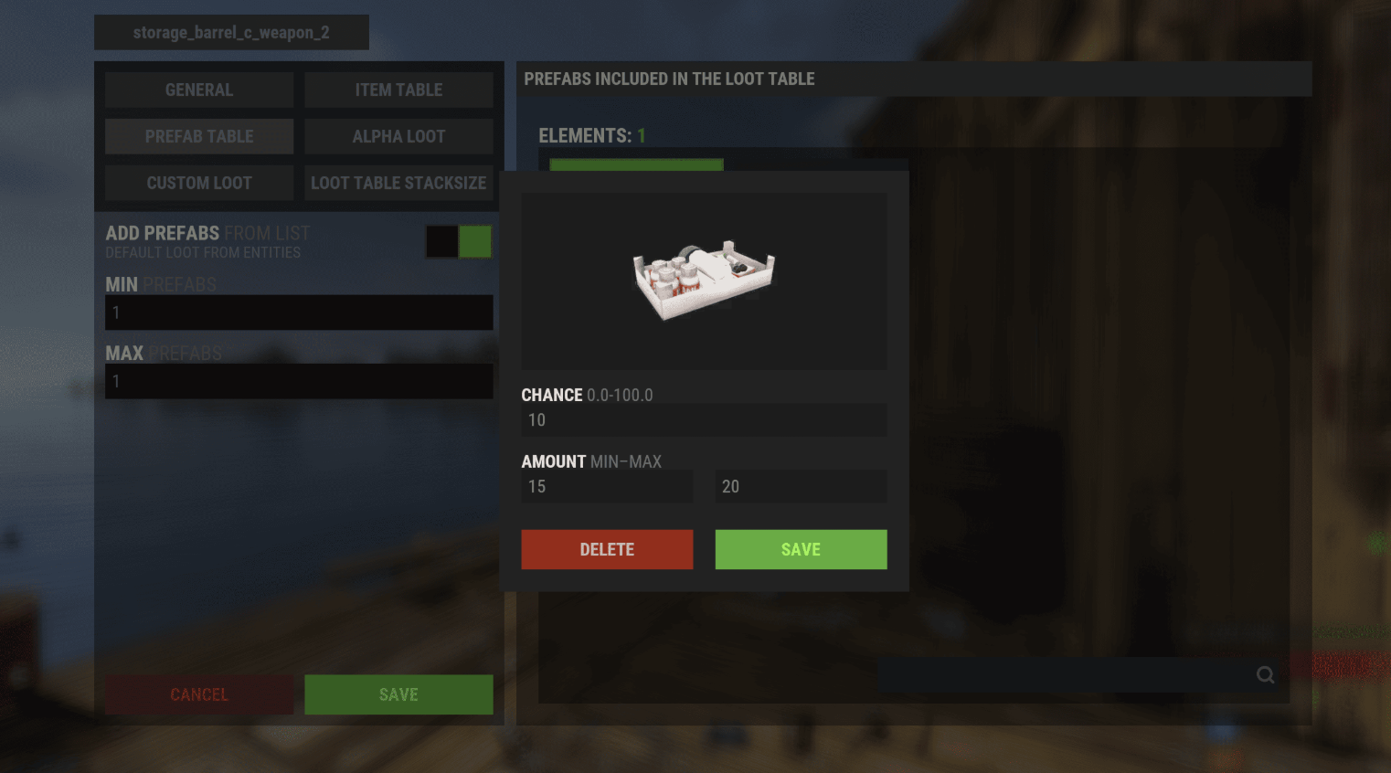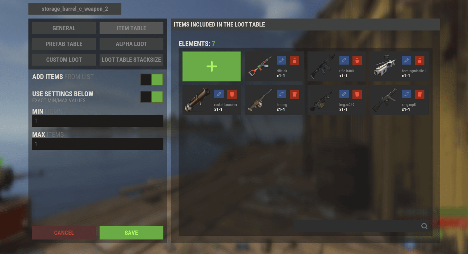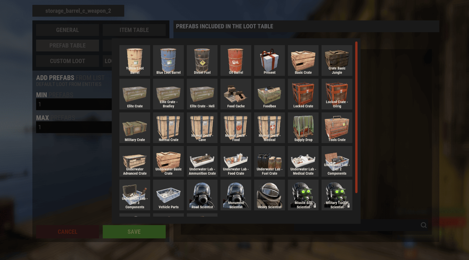 Вы также можете включить опцию «Очистить контейнер» , которая удалит все предметы из контейнера перед добавлением добычи из разделов «Предметы» и «Префабы».