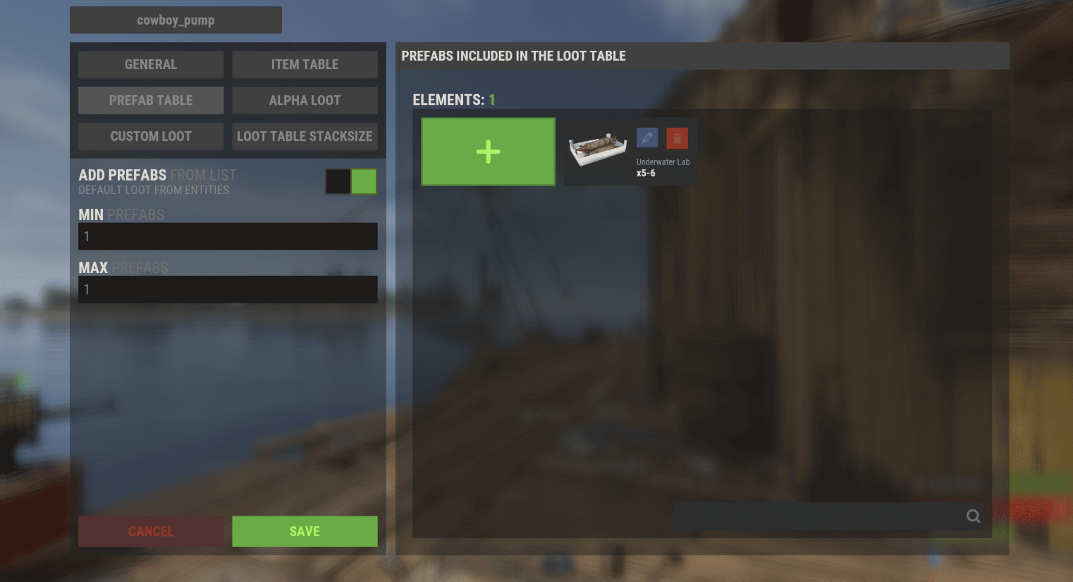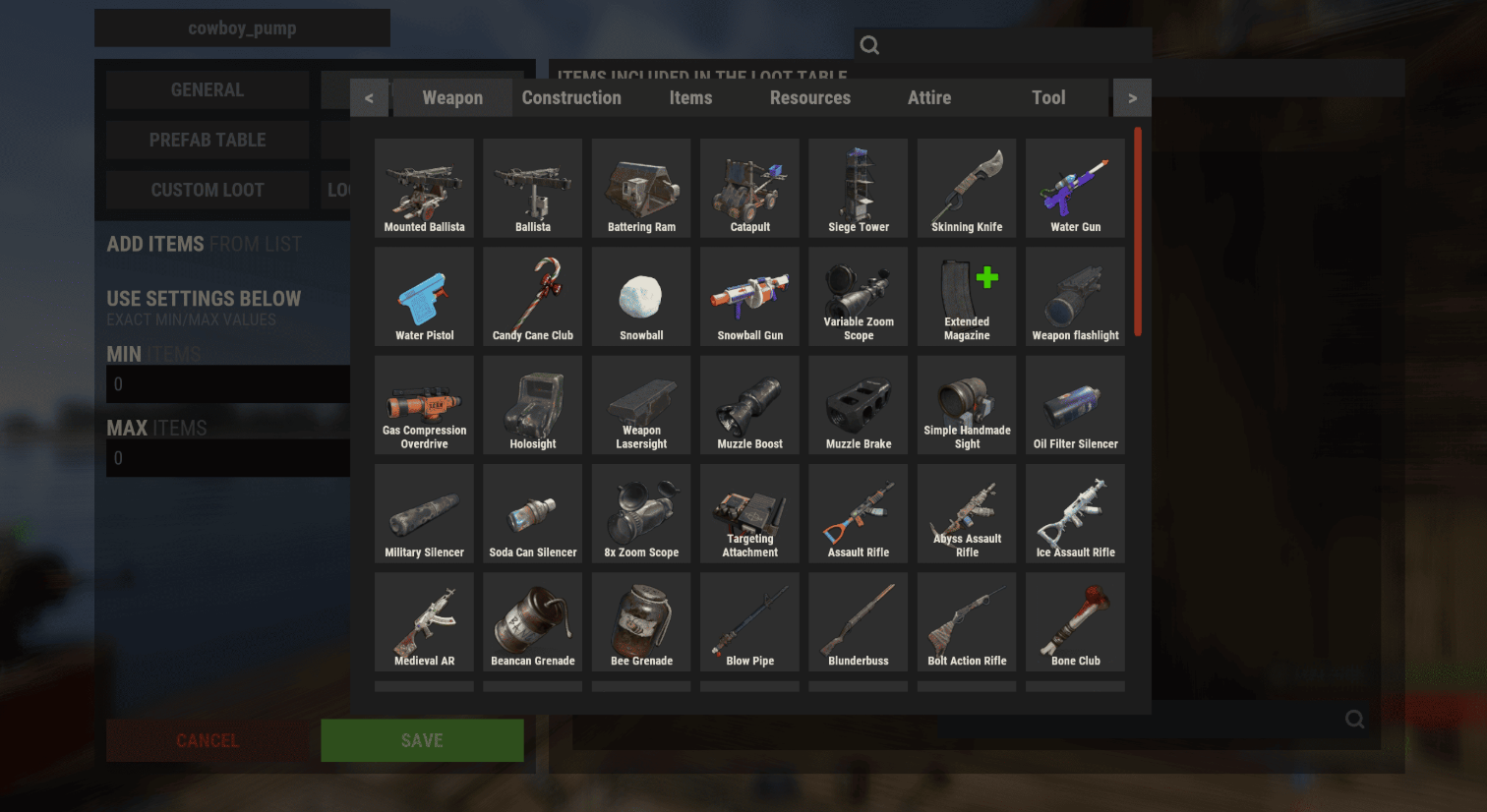 Раздел «Таблица сборных элементов» позволяет добавлять стандартные игровые источники добычи, такие как ящики, бочки или NPC.