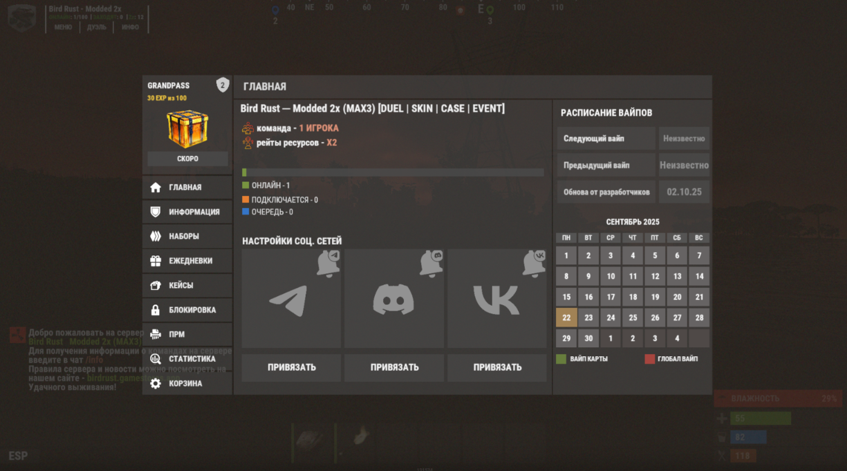 - ГЛАВНАЯ: шапка сервера, онлайн/очередь, календарь вайпов, быстрые блоки и социальные ссылки.