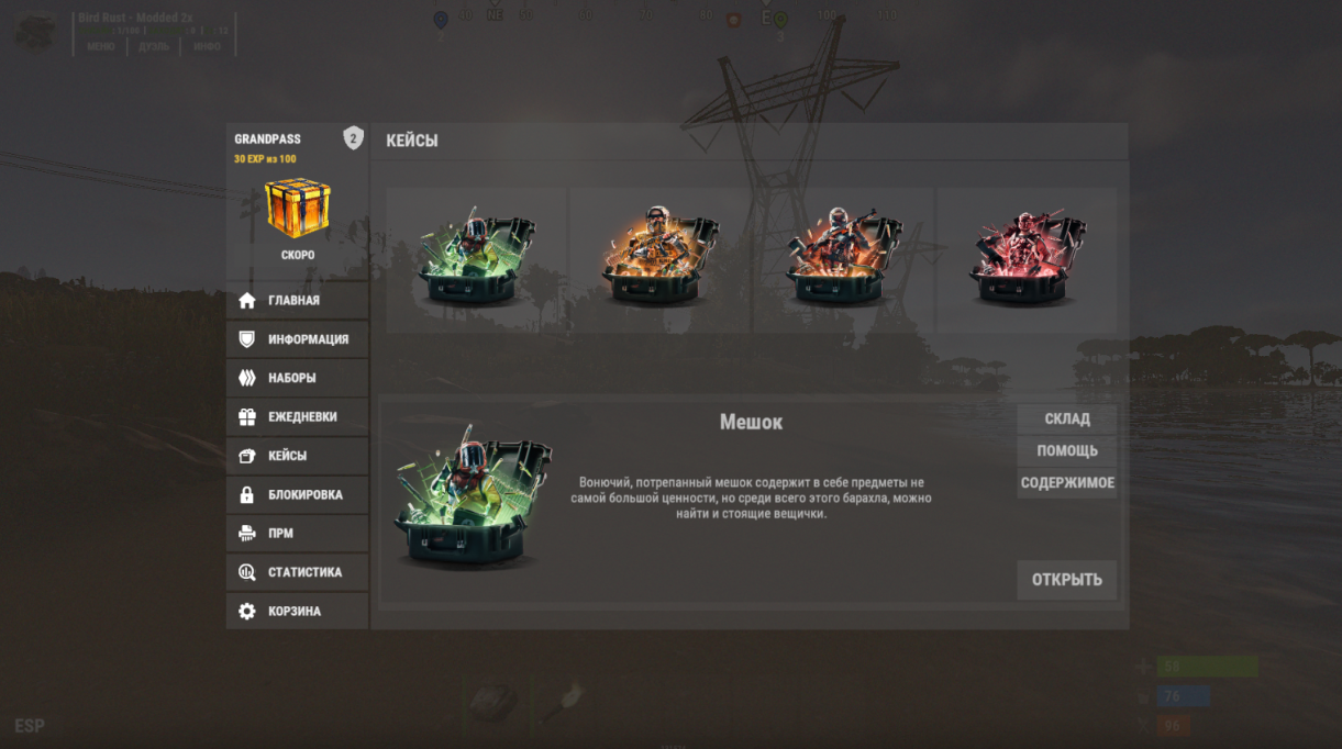 - КЕЙСЫ: кейс‑система, уровни/XP (GrandPass), прозрачные шансы и аккуратные анимации.