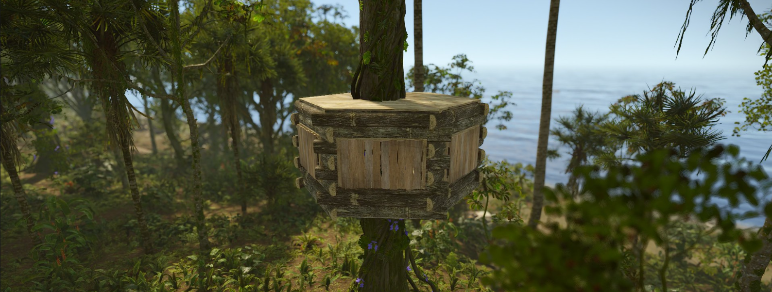 Подойдите к дереву в джунглях и удерживайте клавишу E, чтобы захватить его. Появится небольшая стартовая платформа, с которой вы можете сразу начать строительство.После захвата территория вокруг дерева становится вашим местом для строительства. Размещённые вами строительные детали со временем разрушаются, но само дерево защищено от повреждений, пока оно ваше.